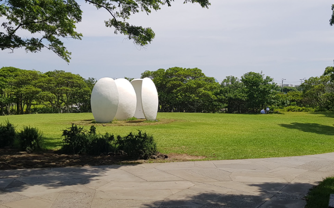 도착 후 뮤지엄 건물 앞 넓은 잔디광장에서 첫 인생샷. 녹차밭 배경으로 건물 전경 촬영 포인트.